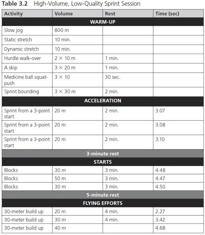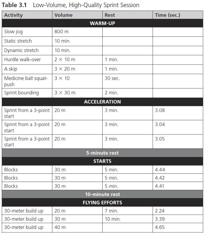 Looking at Table 3.1, you'll notice the progressive buildup of flying sprints – starting with 20m, then 30m, and finishing with 40m efforts. This methodical approach to maximum velocity work creates a bigger "speed ceiling."